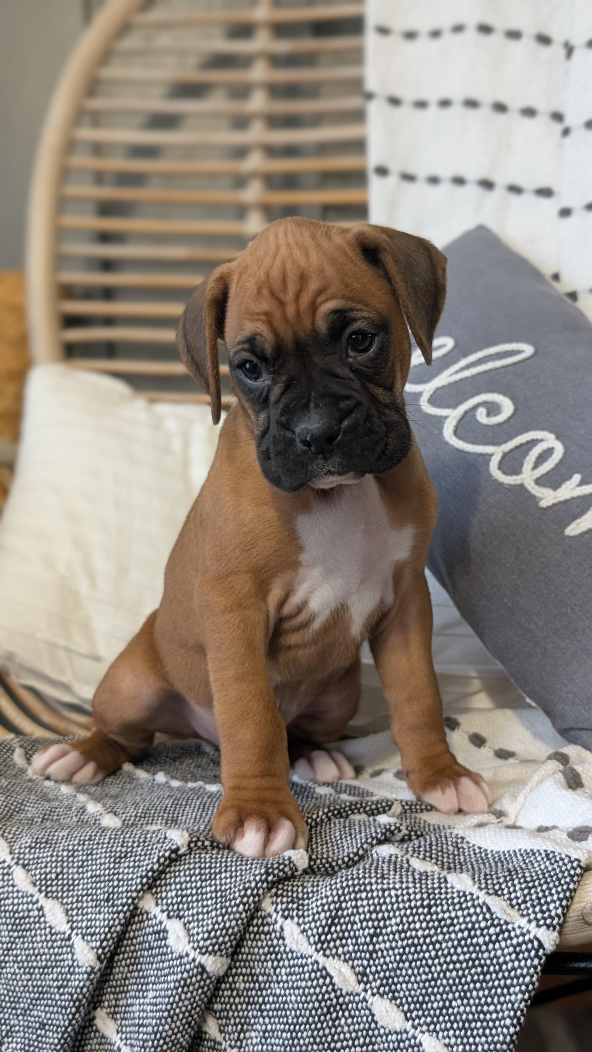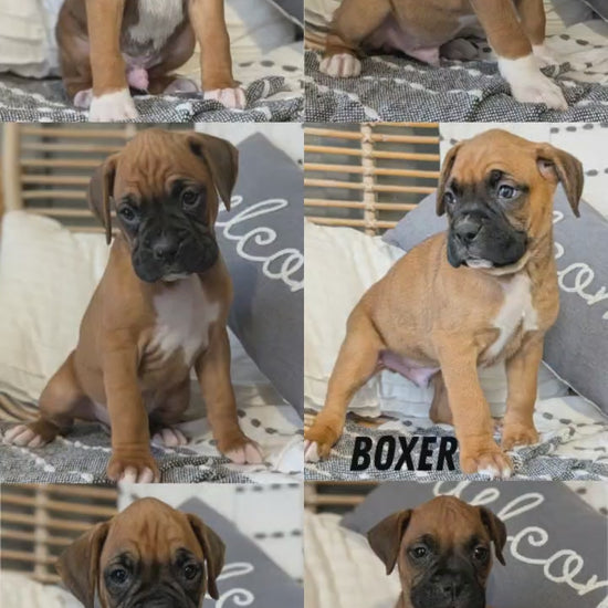 Handsome, sweet AKC Boxer pups; great with other dogs and with kids. Microchipped, expected to be 75 pounds full grown and well suited to an active indoor/outdoor lifestyle. Love tussling over their toys, exploring and causing mischief.