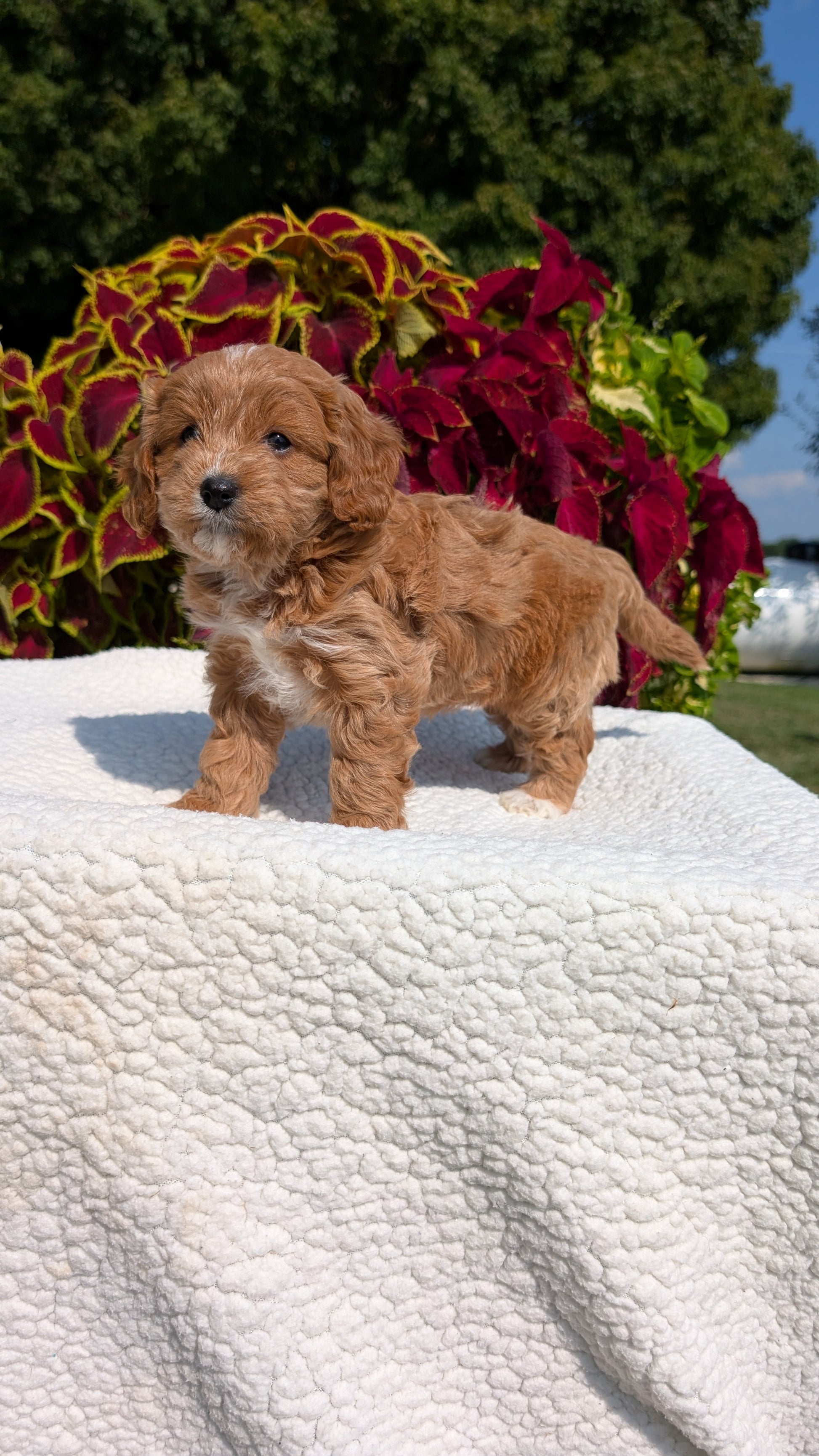 Hypoallergenic, lively CavaPoo pups; very sweet and playful. Mom is a purebred Cavalier weighing 13 pounds, dad is an 8 pound red Poodle. Energetic, love exploring and snuggling (see videos), will fit very well into a semi-active lifestyle and stay relatively small at 10-11 inches tall. Up to date on vaccinations and will be vet checked before going to new home. In-person visits, video chat available. Local pickup in northern Indiana, public meetup and shipping/delivery available anywhere within the contiguous United States.