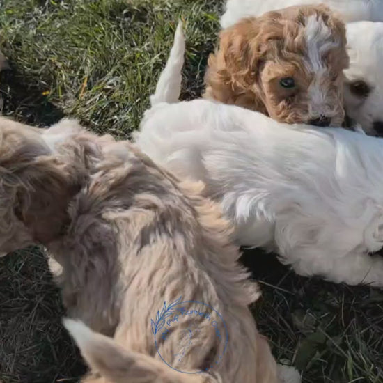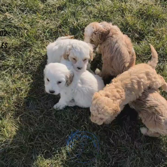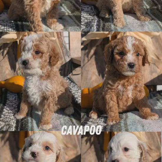 Sweet, lively CavaPoo pup; hypoallergenic and great with kids. Loves exploring, playing with litter mates; will fit in well in an indoor, active lifestyle. Expected to be 12-14 pounds full grown and stand just over a foot tall.