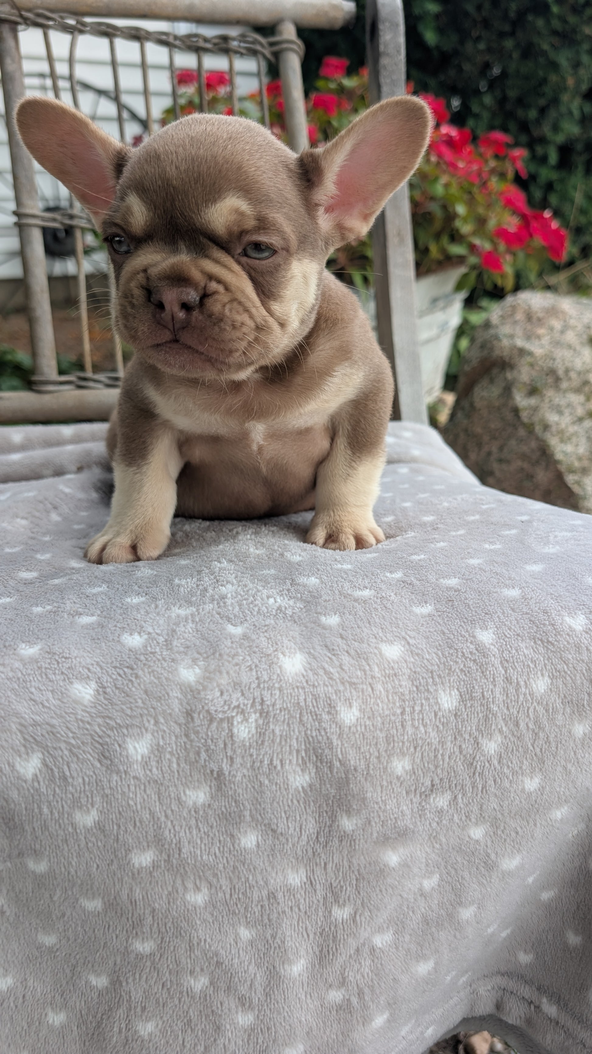 Handsome, sweet and lively AKC French Bulldog pup; picture perfect chocolate with tan points. Great with kids and other pups, well suited to a laid back lifestyle. Dad is a 28 pound merle with green eyes, mom is blue and 25 pounds; both stand 12 inches tall. Love exploring outdoors (see videos), and both ears are standing up by themselves. Up to date on vaccinations/dewormers and will be vet checked before going to new home. In-person visits, video chat available. Local pickup in northern Indiana, public meetup and shipping/delivery available anywhere within the contiguous United States.