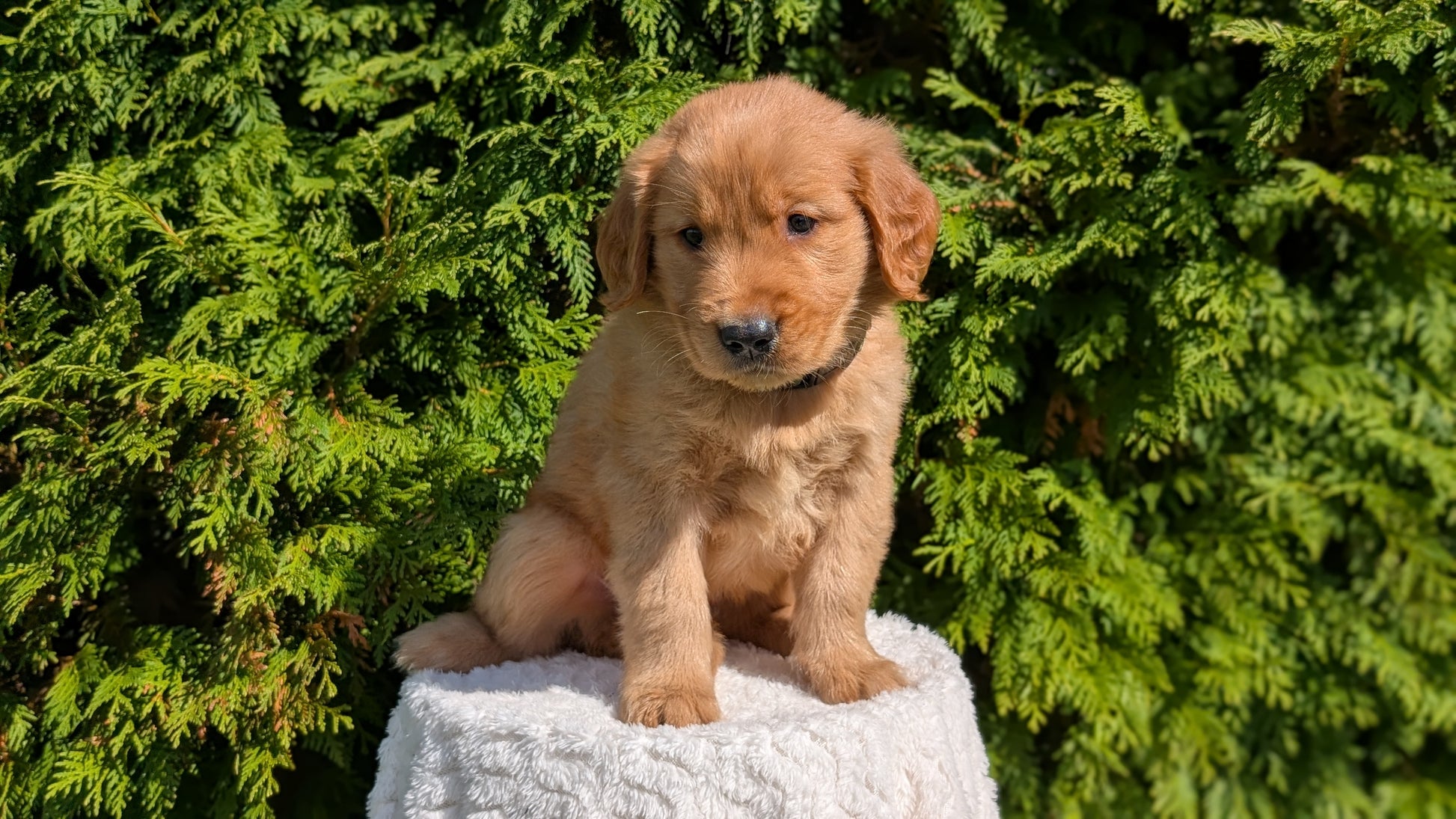 Beautiful red, AKC Golden Retriever pup; raised in a family environment and great with kids/other dogs. Very playful and sweet, loves playing outdoors and well suited to an active lifestyle and lots of room to explore. Mom is dark red and weighs 65 pounds, dad is red and weighs 75 pounds; pups expected to stand 23-24 inches tall full grown. Up to date on vaccinations/dewormers and will be vet checked before going to new home. In-person visits, video chat available. Local pickup in northern Indiana, public meetup and shipping/delivery available anywhere within the contiguous United States.