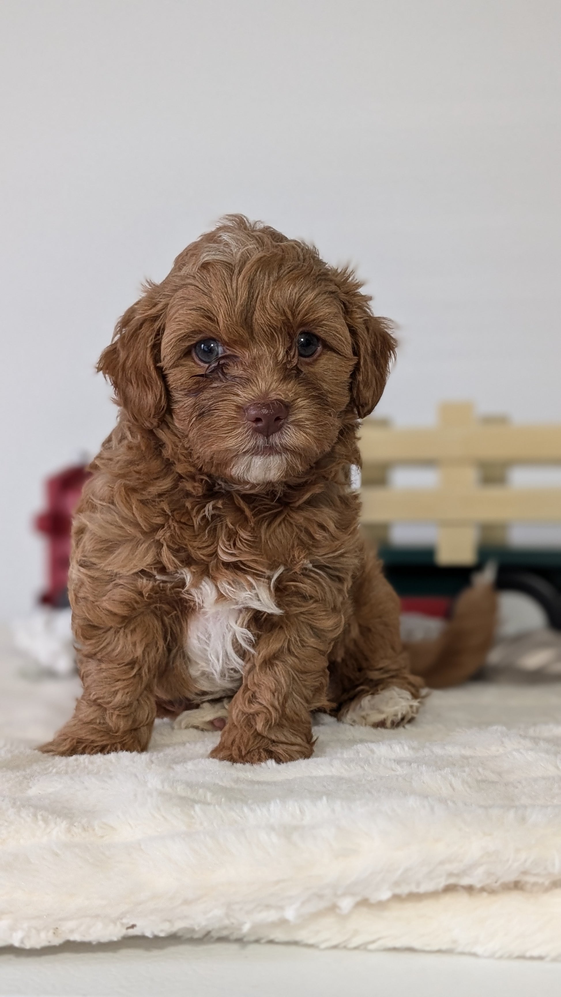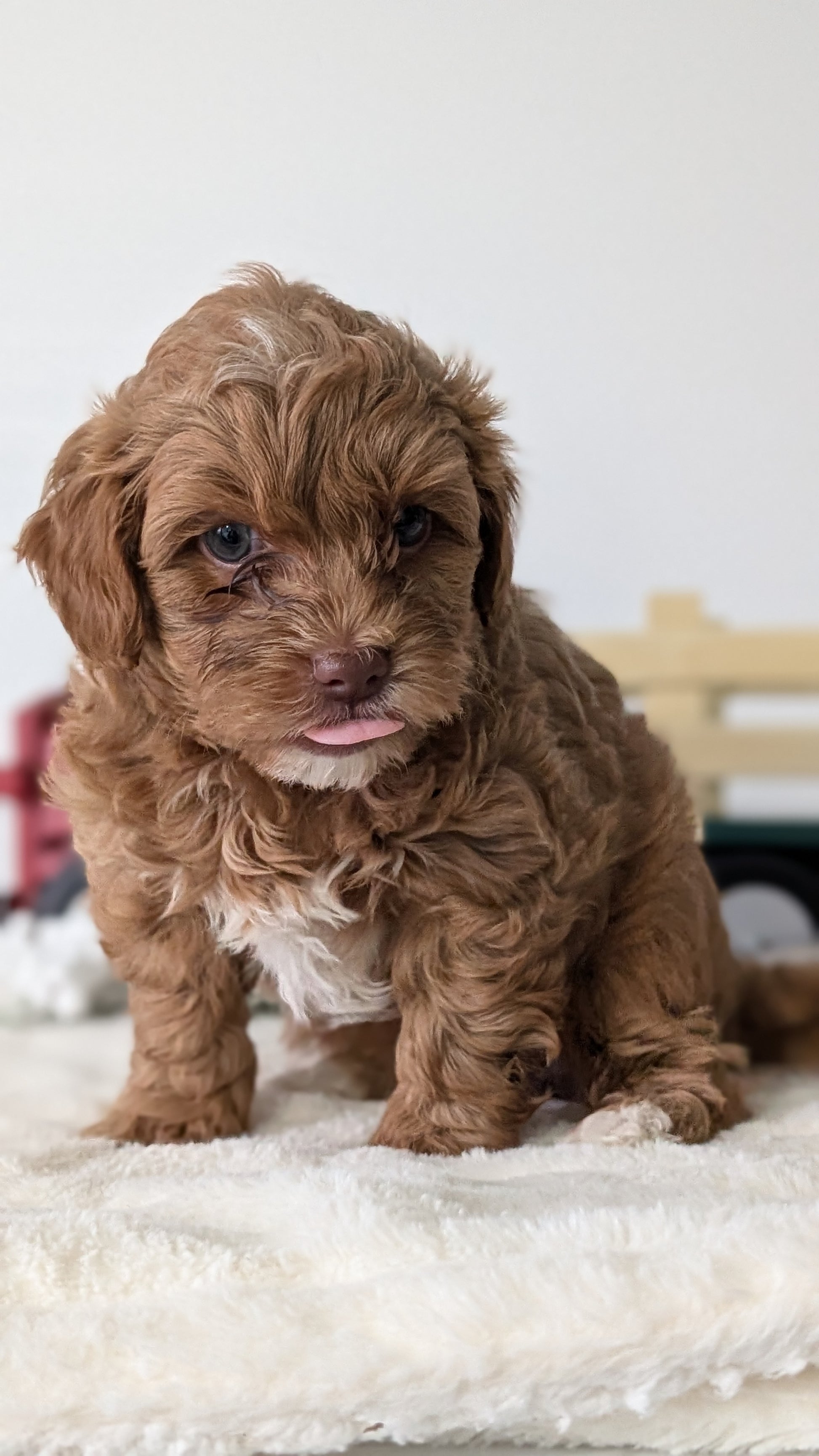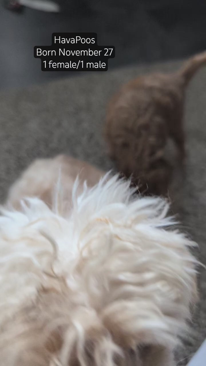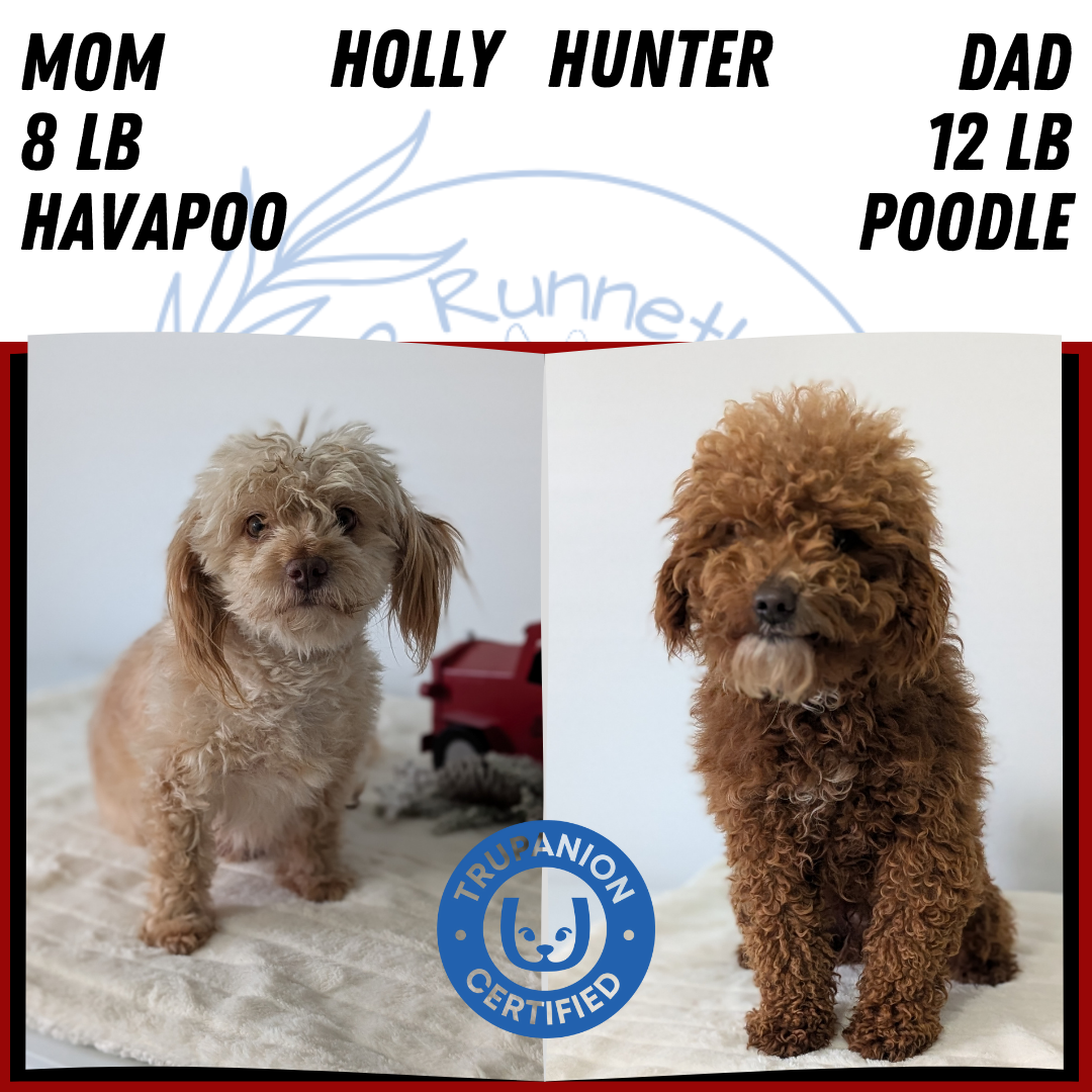 Mom (Holly) is a sweet, beautiful HavaPoo; loves her toddler hooman and is great with other dogs. She weighs 8 pounds, has a chocolate nose and green eyes. Dad (Hunter) is a handsome dark red Poodle weighing 12 pounds; is great with other dogs and very well mannered.