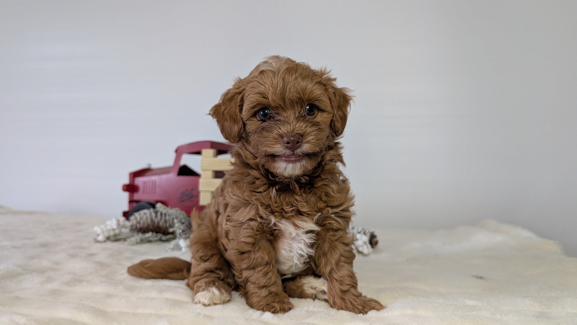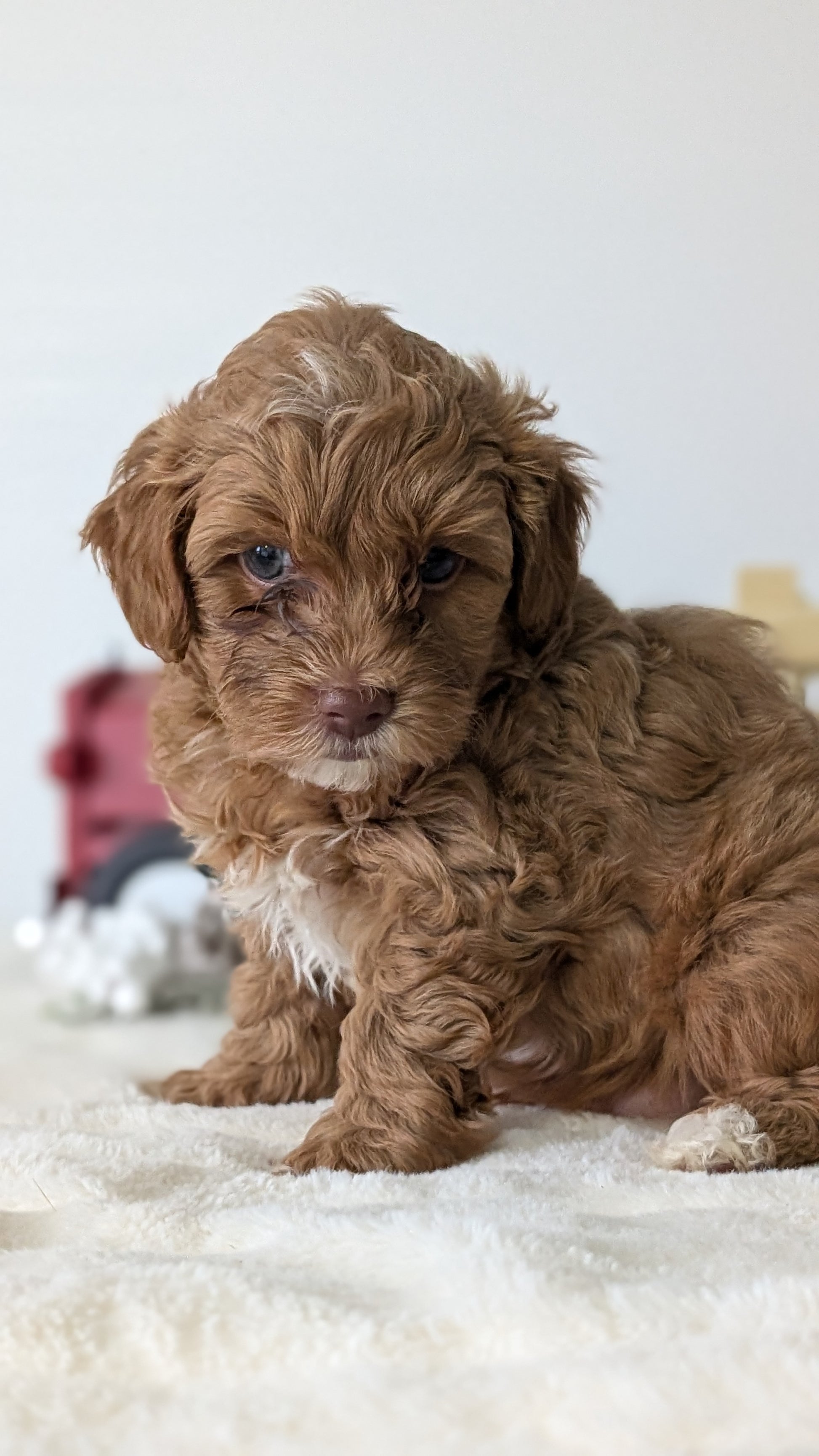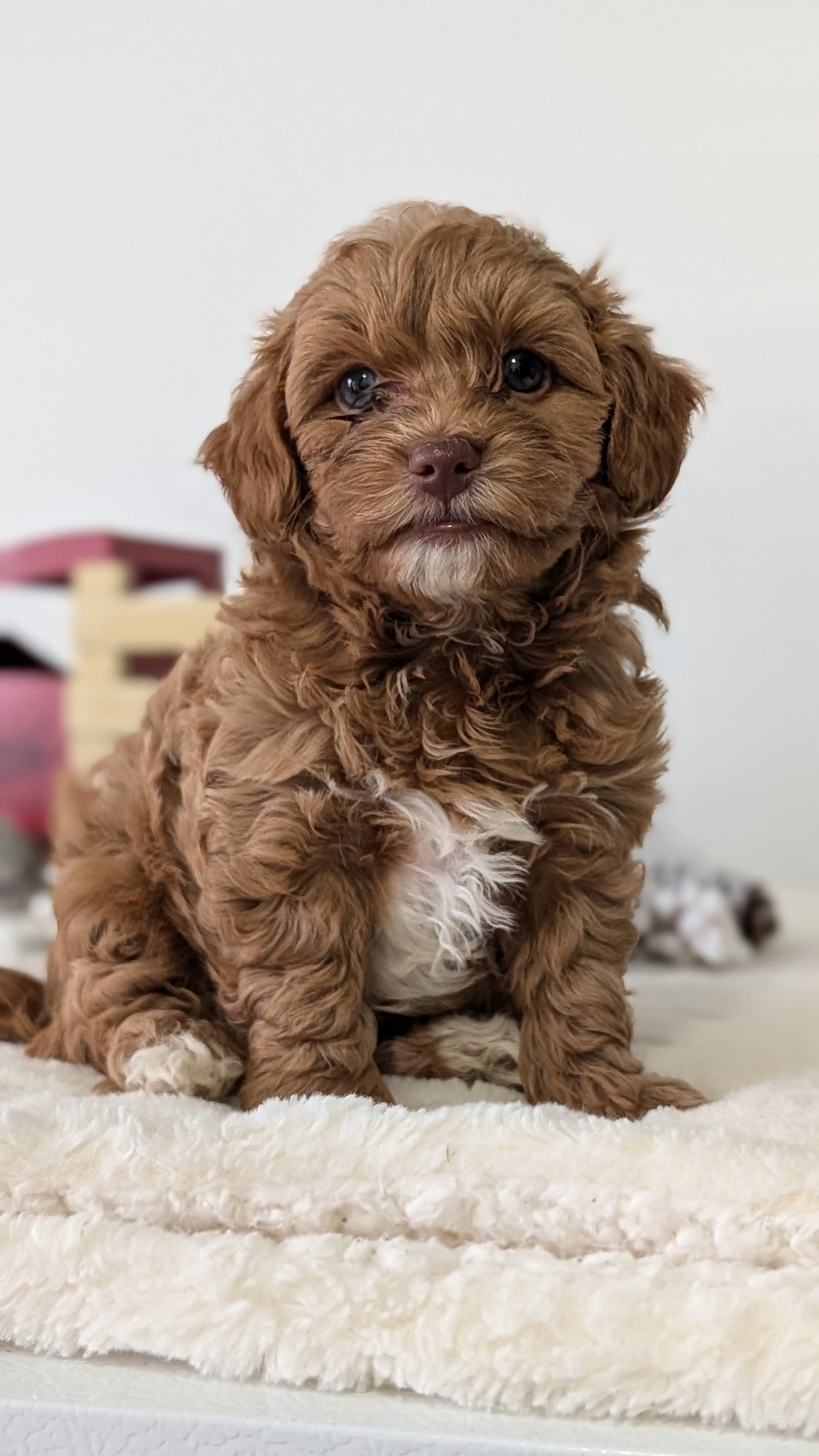 Mom (Holly) is a sweet, beautiful HavaPoo; loves her toddler hooman and is great with other dogs. She weighs 8 pounds, has a chocolate nose and green eyes. Dad (Hunter) is a handsome dark red Poodle weighing 12 pounds; is great with other dogs and very well mannered.