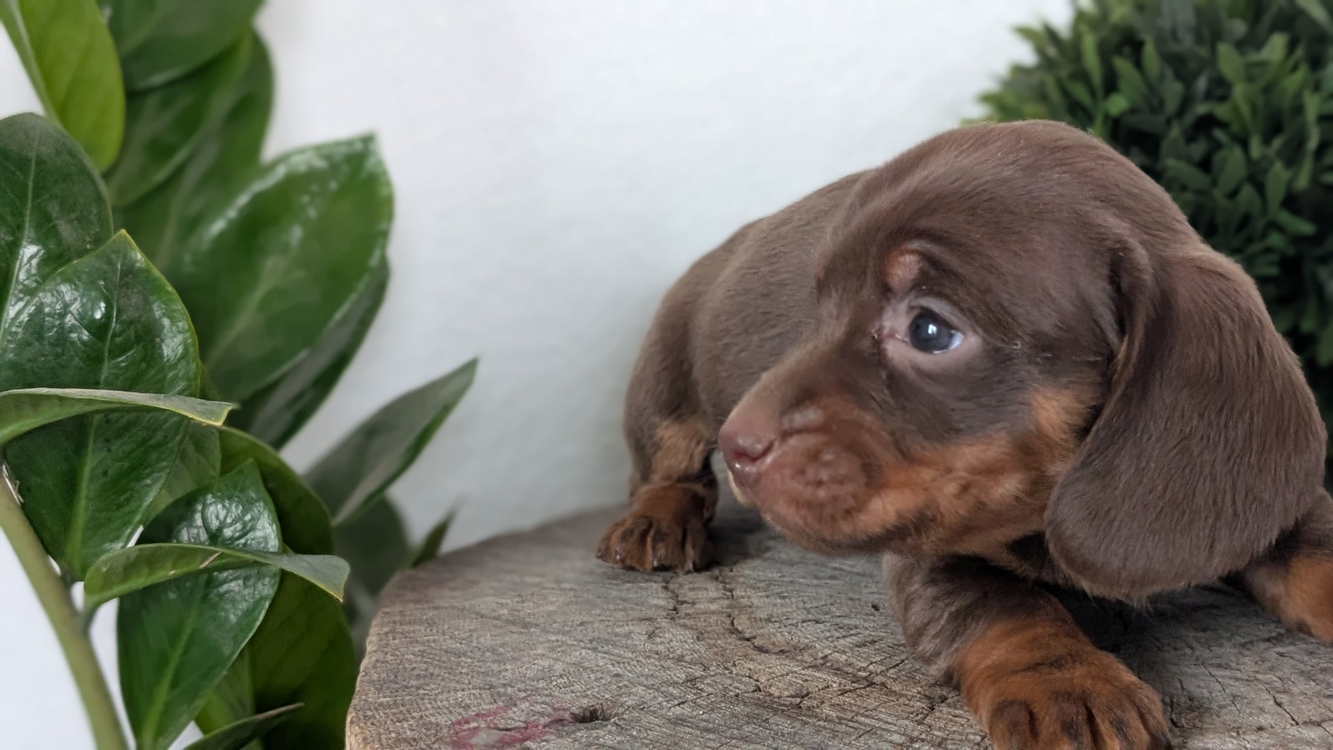 Incredibly cute and sweet chocolate phantom Mini Dachshund pup; well socialized with kids and great with other dogs. A great fit in a semi-active, urban lifestyle; with daily walks and mental stimulation. Expected to be 8-10 pounds full grown, short haired and 6-7 inches tall. Mom (Aly) is short haired, black/tan; a very sweet and loving dog (see videos). Dad (Choc) is chocolate and long haired, great with kids and other dogs.