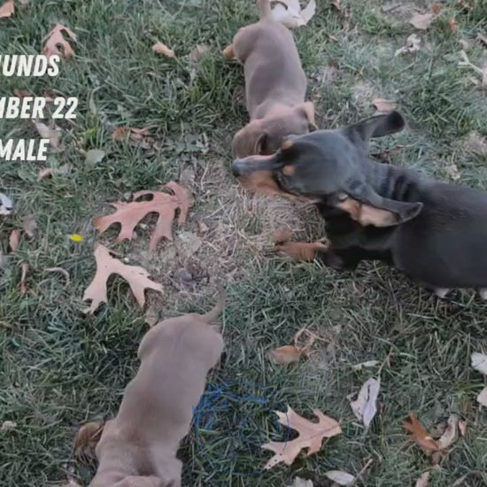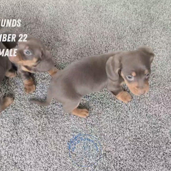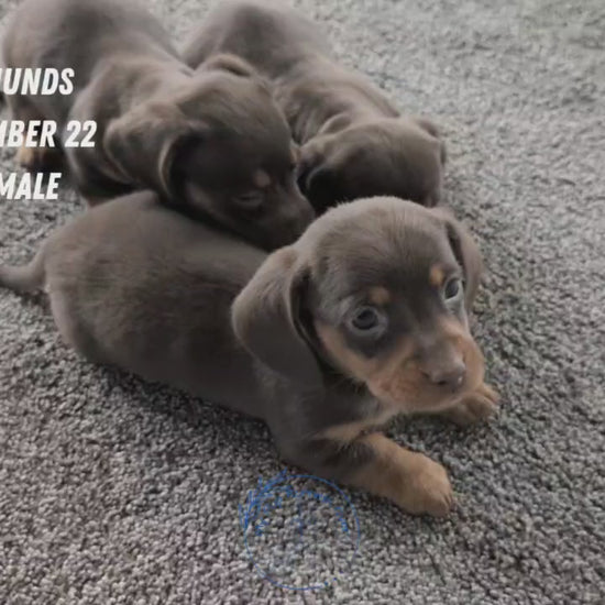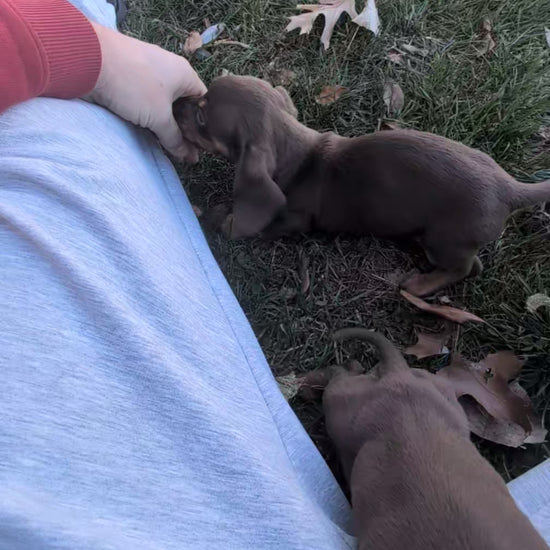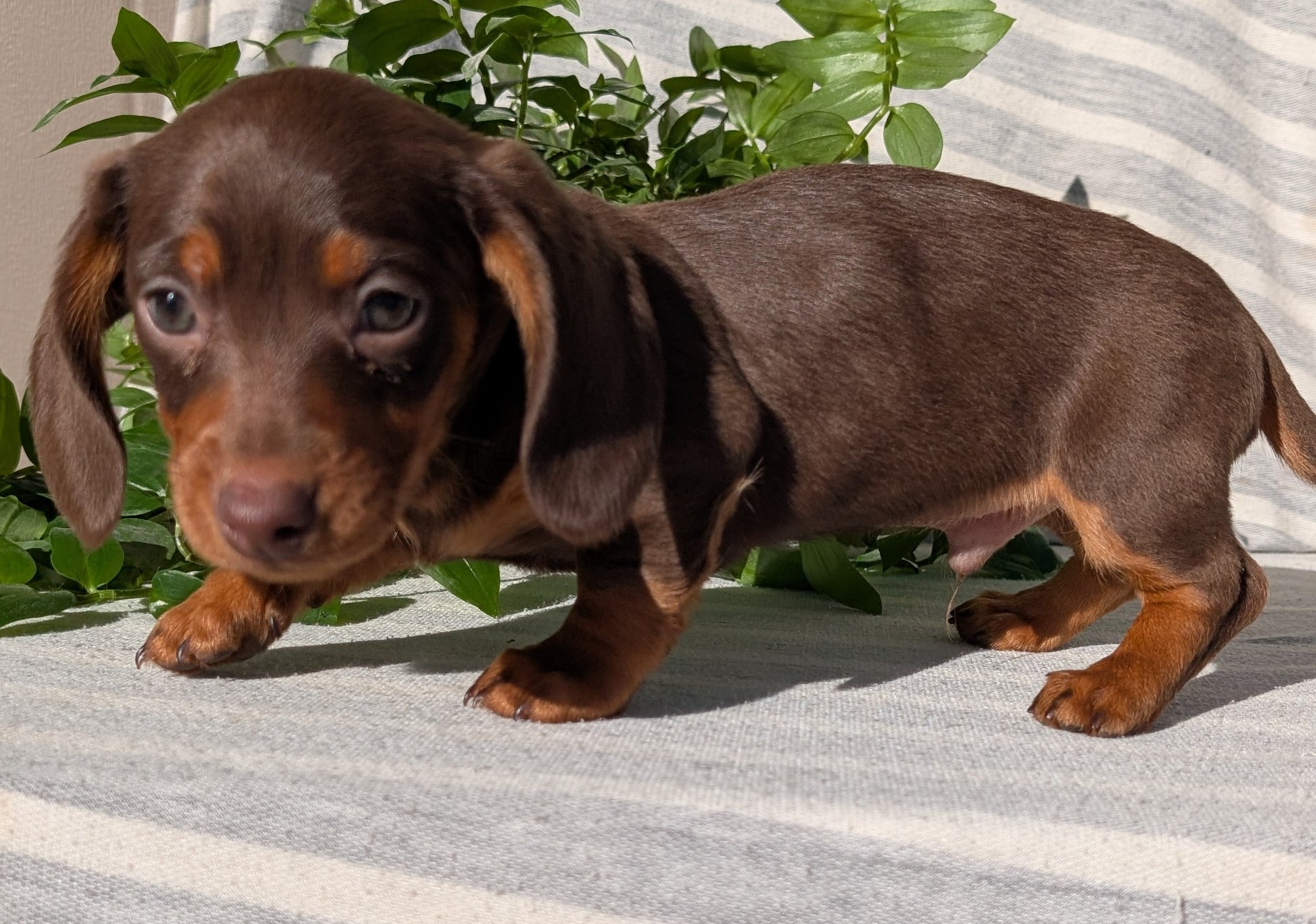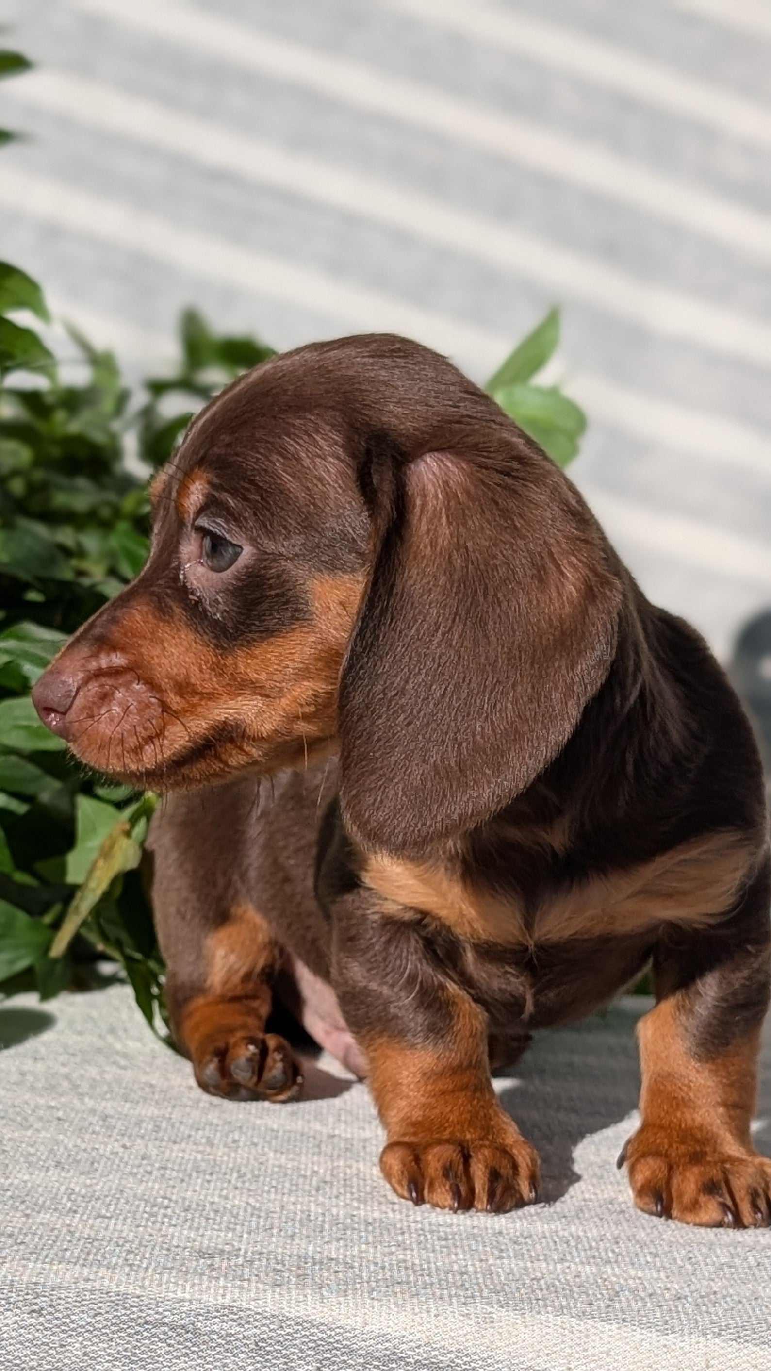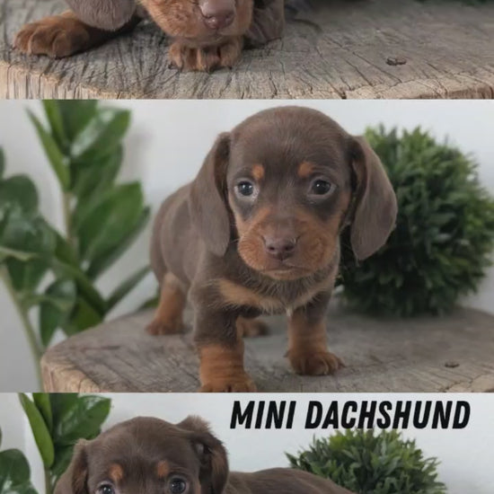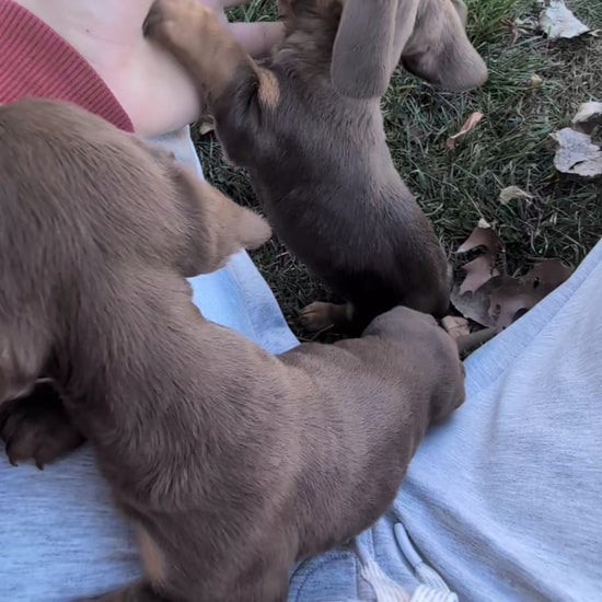 Incredibly cute and sweet chocolate phantom Mini Dachshund pups; well socialized with kids and great with other dogs. A great fit in a semi-active, urban lifestyle; with daily walks and mental stimulation. Expected to be 8-10 pounds full grown, short haired and 6-7 inches tall. Mom (Aly) is short haired, black/tan; a very sweet and loving dog (see videos). Dad (Choc) is chocolate and long haired, great with kids and other dogs.