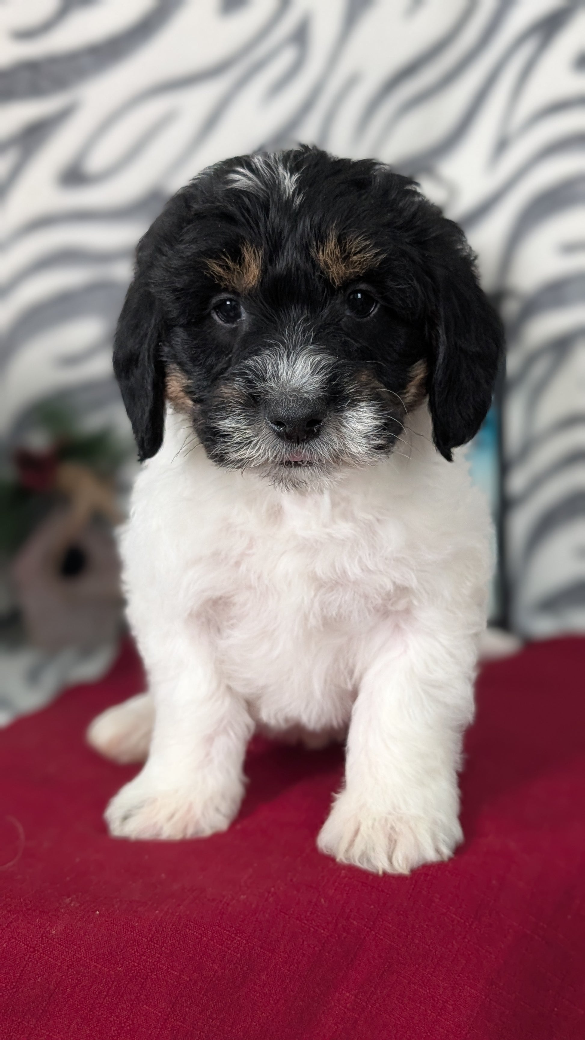 Beautiful and sweet Mini Labradoodle pup; hypoallergenic and great with kids. Expected to be just under 20 pounds full grown; well suited to an active, indoor/outdoor, suburban lifestyle. Very well socialized with other dogs/small animals.