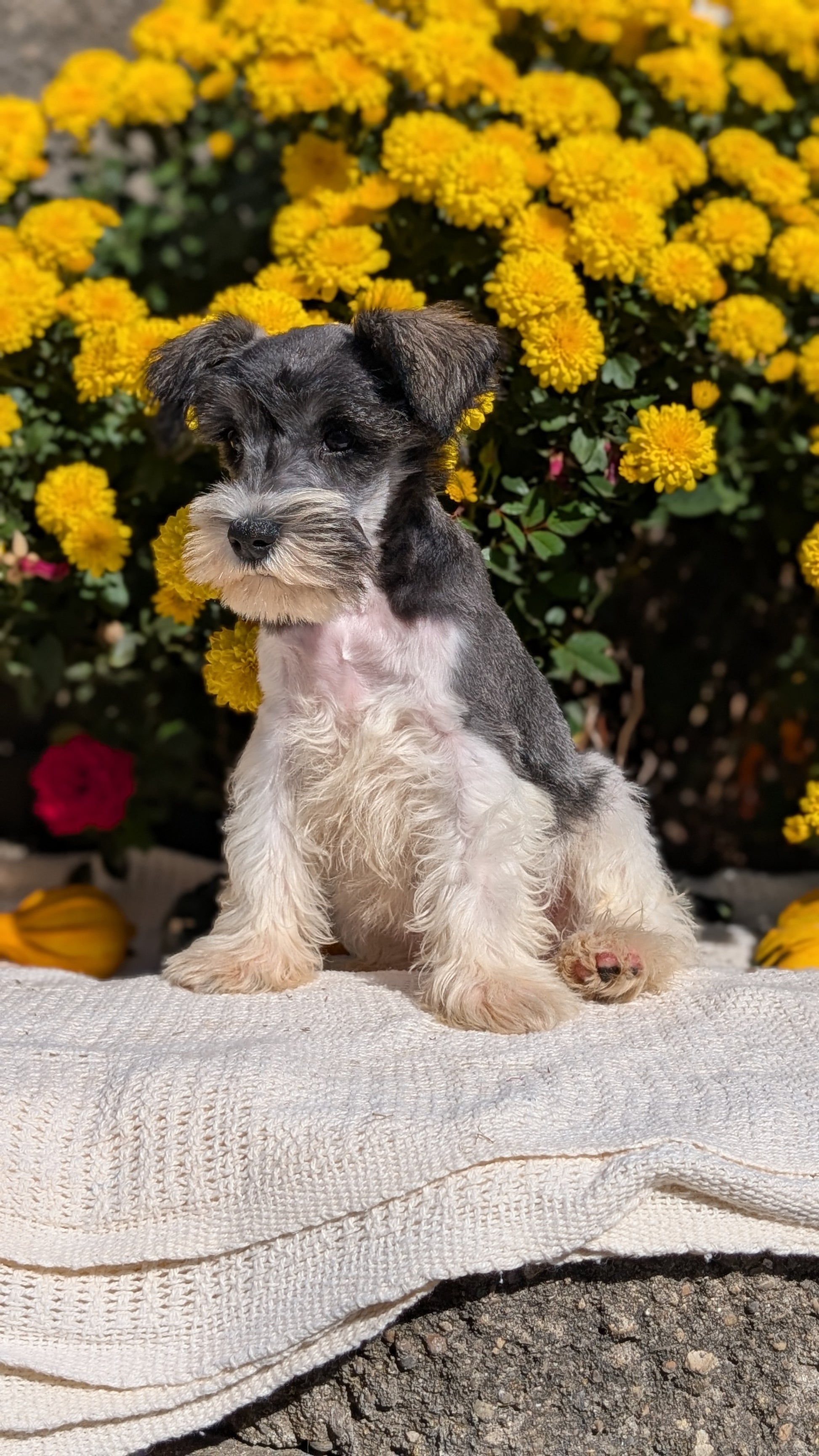 Adorable, sweet AKC Mini Schnauzer pups; great with kids and other dogs. Well suited to a semi-active indoor/outdoor lifestyle with daily walks, socialization and mental stimulation. Expected to be just over 20 pounds/13 inches full grown; mom (Stella) is silver/white, dad (Snickers) is silver with liver points. Up to date on vaccinations/dewormers and will be vet checked before going to new home. In-person visits, video chat available. Local pickup in northern Indiana, public meetup and shipping/delivery available anywhere within the contiguous United States.
